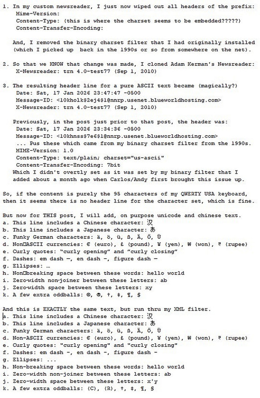 The charset problem only happens when I copy and paste text from outside my >text editor into the editor that feeds the posting scripts, and when I